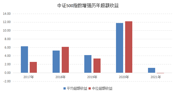 2021年公募500增强平均超额收益1.19%,中位值-0.12%,同比看分别下降了10.63和12.30个百分点,衰退极其显著。但由于2021年500全收益指数上涨了17.24%(放在公募股票产品中看,1/3线是14.72%,1/4线是18.98%,介于1/3到1/4线之间),因而即便从整体幅度看,500增强的收益在同类中也处于比较领先的水平。