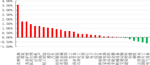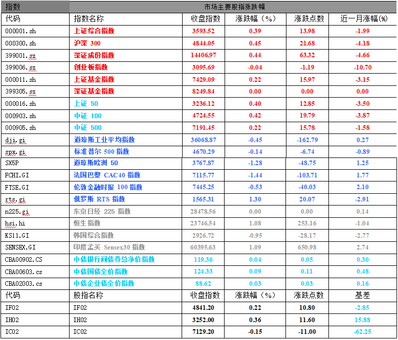 昨日,沪深两市双双收涨。截止收盘,上证综指收于 3593.52 点,涨 13.98 点,涨幅为 0.39%;深成指收于14406.97 点,涨 63.32 点,涨幅为 0.44%;沪深 300 收于 4844.05 点,涨 21.68 点,涨幅为 0.45%;创业板收于3095.69 点,跌 1.19 点,跌幅为 0.04%。两市成交 10513.83 亿元,较前一日交易量减少 16.22%。大盘股强于小盘股。中证 100 上涨 0.42%,中证 500 上涨 0.22%。31 个申万一级行业中有 25 个行业上涨。其中,农林牧渔、煤炭、美容护理表现居前,涨跌幅分别为 3.59%、1.75%、1.74%,公用事业、国防军工、电气设备表现居后,涨跌幅分别为-0.43%、-0.53%、-0.63%。沪市有 1109 只个数上涨,占比 63.30%,深市有 1682 只个数上涨,占比67.23%。非 ST 个股中,71 只个股涨停,10 只个股跌停。股指期货主力合约涨跌不一,但皆低于现货指数。