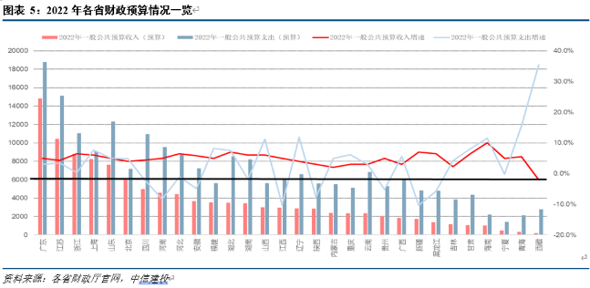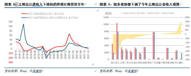 政府性基金收入方面财政需要持续关注土地出让金收入下行的冲击。由于土地市场仍在冷却期,今年上半年土地市场回暖反弹的概率不大,叠加土地出让金缴款的时滞问题,预计今年上半年土地出让金收入增速会继续延续去年以来的低迷状态。根据目前已公布的各省2022年土地出让金收入水平,近十个省份已经下调今年的预期卖地收入水平,地方财政收入上半年的风险暴露水平相对较高。我们判断房地产市场的宽松政策在两会之后会密集出台,托底当下不断下滑的房地产市场,一方面,房地产市场是我国经济的支柱产业,对于居民收入、就业、金融稳定等均有重要意义;另一方面,房地产产业链对地方财税贡献极大,一个稳定的房地产市场对于稳定财税系统、防范财政收支风险也有非常大的意义。