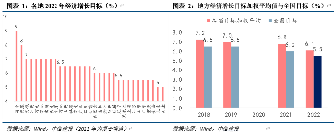 经济增长目标定在5%的概率较低。从各地两会公布的2022年经济增长目标来看,北京和天津目标相对最低,均5%,而其他29地的目标均在5.5%及以上,其中8地5.5%,5地6%,7地6.5%,7地7%,西藏8%,海南9%。因此全国目标参照最低的北京、天津来制定的概率较低。从历史经验和目标平稳衔接的要求看,目标定在5.5%的概率大。近3年,全国目标在各省目标均值的基础上打了9折左右,2022年各省目标均值约6.1%,全国在此基础上打九折则约为5.5%。此外,近年我国经济目标下调幅度一般为0.5个百分点,去年经济增长目标为6%以上,从“与今后目标平稳衔接”的要求来看,今年定在5.5%的概率较大。