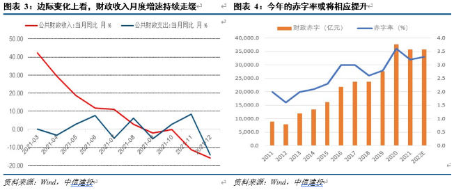 跨周期调节下的财政收支预计将稳中求进,收入增速或将有所回落,支出增速或将有所提升。2021年的财政收支整体呈现出多收少支的局面,全国一般公共预算收入首次突破20万亿元,达到20.25万亿元,比上年增长10.7%,与2019年相比增长6.4%,完成超收4889亿元。超收资金除了进行账本之内的腾挪之外,预计会结转到今年形成财力。但从边际变化上看,21年一般公共预算财政收入增速动能已经出现衰微的迹象,去年受益于经济恢复和大宗商品涨价而出现的收入高增在今年可能不会再现。另外,根据财政部近期表态,今年将继续推进大规模减税降费,预计今年减税降费力度有望进一步突破1.3万亿,或将对财政收入造成一定影响。