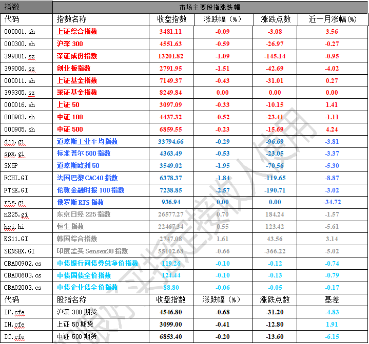 昨日,沪深两市双双收跌。截止收盘,上证综指收于3481.11点,跌3.08点,跌幅为0.09%;深成指收于13201.82点,跌145.14点,跌幅为1.09%;沪深300收于4551.63点,跌26.97点,跌幅为0.59%;创业板收于2791.95点,跌42.69点,跌幅为1.51%。两市成交10101.69亿元,较前一日交易量减少2.95%。小盘股强于大盘股。中证100下跌0.52%,中证500下跌0.23%。31个申万一级行业中有15个行业上涨。其中,交通运输、煤炭、房地产表现居前,涨跌幅分别为3.07%、2.52%、1.53%,美容护理、电力设备、汽车表现居后,涨跌幅分别为-1.46%、-1.87%、-2.00%。沪市有873只个数上涨,占比48.91%,深市有870只个数上涨,占比34.77%。非ST个股中,78只个股涨停,6只个股跌停。股指期货主力合约3个合约均下跌,其中,1只期指好于现货指数。