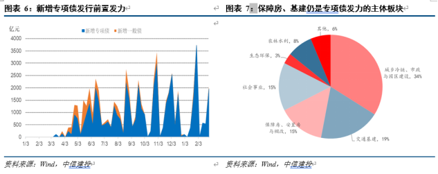 从政府性基金支出角度观察,专项债已经成为今年跨周期稳增长的重要财政工具。在去年12月提前下达1.46万亿的提前批额度之后,今年一二月份出现了新增专项债发行的“开门红”,截止到2月26日,新增专项债发行额已经达到8900亿元,发行进度已经近六成。从当前专项债的主要投向观察,去年财政部一再强调的保障房建设、冷链物流、市政园区建设和交运基建类别仍然是主要构成组分,预计两会之后专项债额度应该会在去年的基础上适度扩容,以对冲一般公共预算收入增速放缓的压力,为稳增长目标形成“更多实物工作量”。我们预计专项债总额度应该会定在3.75万亿左右,专项债使用范围会进一步扩容。