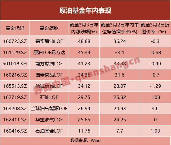 3月3日,截至收盘,原油LOF易方达涨停,涨幅为9.97%,报收1.279元,创下近年新高;紧随其后,嘉实原油LOF场内价格大涨9.64%,南方原油LOF、信诚商品LOF分别上涨7.39%、6.34%,9只原油基金中4只涨幅超过5%,均创下近年新高。