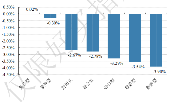 上周,国内基金涨跌不一,其中涨幅最大的是货币型基金,涨幅为 0.02%。其它基金全部下跌,跌幅最大的是股票型和指数型基金,跌幅为-3.54%和-3.9%。