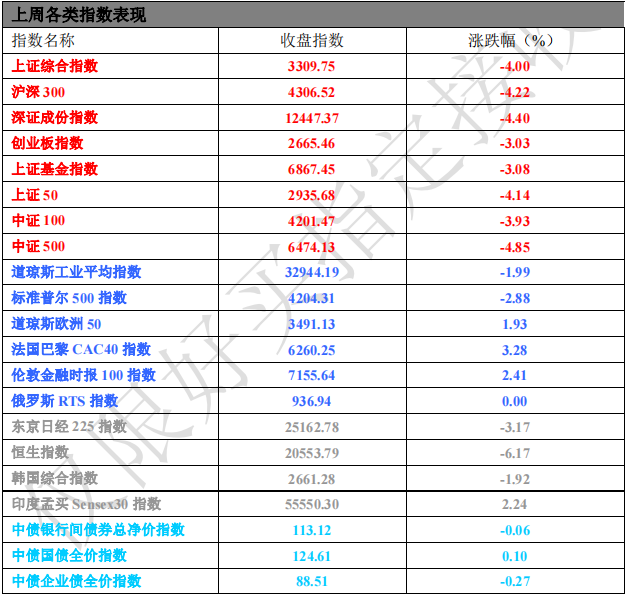 股票基金:多重负面叠加,市场大幅调整:上周受俄乌局势反复、海外监管升级、国内金融数据不及预期,疫情扰动加大等利空,市场情绪波动较大,各大指数下跌明显,沪深 300、中证 500、创业板指本周涨跌幅分别为-4.22%、-4.85%、-3.03%。板块方面,电新、医药、食品饮料表现较好,有色、石化、钢铁跌幅居前。