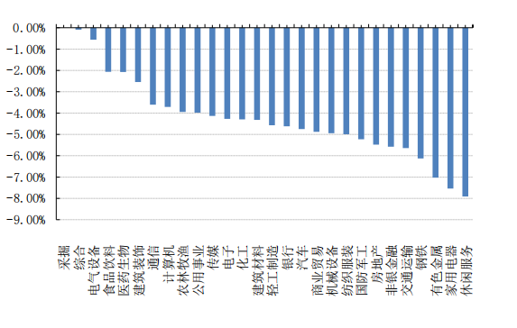 上周,沪深两市双双收跌。截止收盘,上证综指收于 3309.75 点,跌 137.90 点,跌幅为 4.00%;深成指收于12447.37 点,跌 573.09 点,跌幅为 4.40%;沪深 300 收于 4306.52 点,跌 189.91 点,跌幅为 4.22%;创业板收于2665.46 点,跌 83.18 点,跌幅为 3.03%。两市成交 54251.45 亿元。总体而言,大盘股强于小盘股。中证 100 下跌 3.93%,中证 500 下跌 4.85%。28 个申万一级行业中有无一个行业上涨。其中,采掘、综合、电气设备表现居前,涨跌幅分别为 0.00%、-0.08%、-0.56%,有色金属、家用电器、休闲服务表现居后,涨跌幅分别为-7.03%、-7.54%、-7.91%。