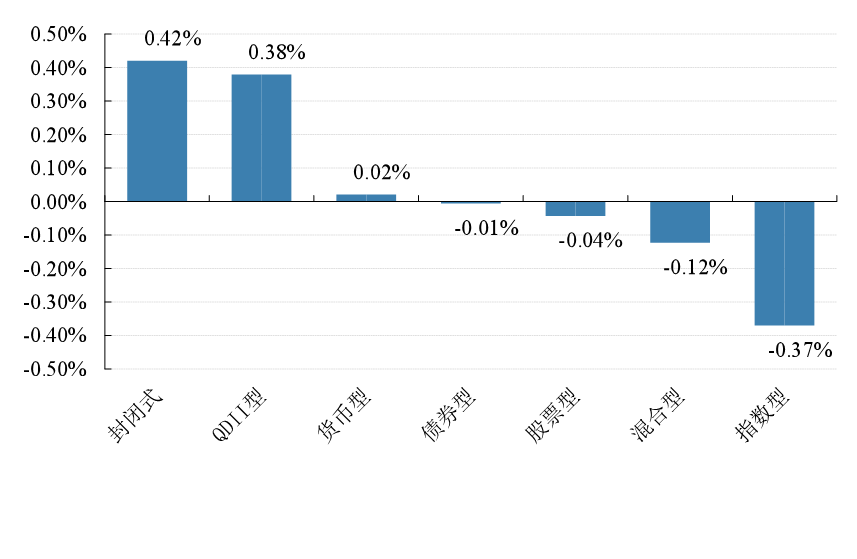 上周,国内基金涨跌不一,其中涨幅最大的是封闭式,涨幅为0.42%,跌幅最大的是指数型基金,涨幅为-0.37%。