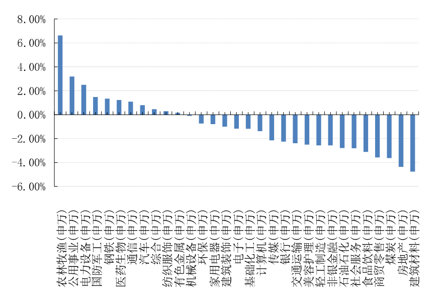 上周,沪深两市双双收跌。截止收盘,上证综指收于3356.08点,跌31.56点,跌幅为0.93%;深成指收于12857.13点,跌3.23点,跌幅为0.03%;沪深300收于4443.47点,跌37.94点,跌幅为0.85%;创业板收于2817.64点,涨35.70点,涨幅为1.28%。两市成交54804.96亿元。总体而言,小盘股强于大盘股。中证100下跌0.78%,中证500下跌0.53%。31个申万一级行业中有11个行业上涨。其中,农林牧渔(申万)、公用事业(申万)、电力设备(申万)表现居前,涨跌幅分别为6.63%、3.19%、2.51%,煤炭(申万)、房地产(申万)、建筑材料(申万)表现居后,涨跌幅分别为-3.63%、-4.36%、-4.76%。