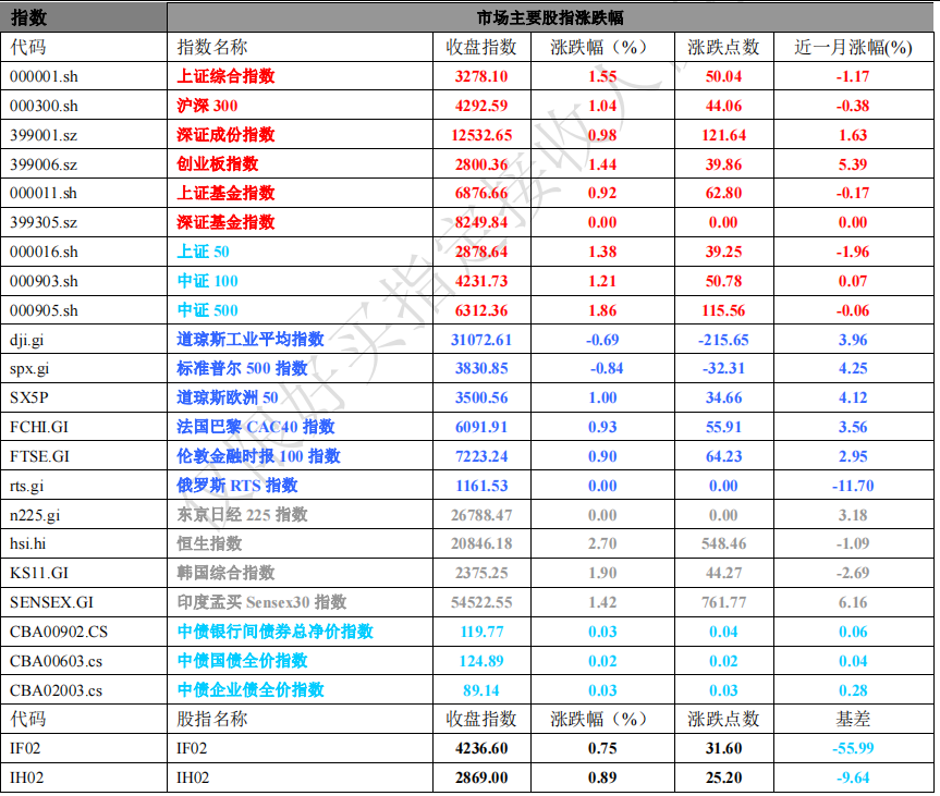 昨日,沪深两市双双收涨。截止收盘,上证综指收于 3278.10 点,涨 50.04 点,涨幅为 1.55%;深成指收于12532.65 点,涨 121.64 点,涨幅为 0.98%;沪深 300 收于 4292.59 点,涨 44.06 点,涨幅为 1.04%;创业板收于 2800.36 点,涨 39.86 点,涨幅为 1.44%。两市成交 10214.03 亿元,较前一日交易量减少 6.13%。小盘股强于大盘股。中证 100 上涨 1.21%,中证 500 上涨 1.86%。31 个申万一级行业中有 30 个行业上涨。