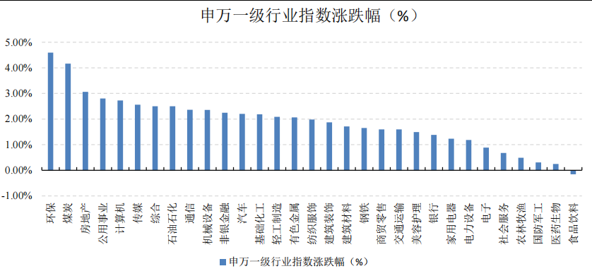 其中,环保、煤炭、房地产表现居前,涨跌幅分别为 4.59%、4.16%、3.06%,国防军工、医药生物、食品饮料表现居后,涨跌幅分别为 0.31%、0.24%、-0.15%。沪市有 1640 只个数上涨,占比 85.91%,深市有 2326 只个数上涨,占比 86.86%。