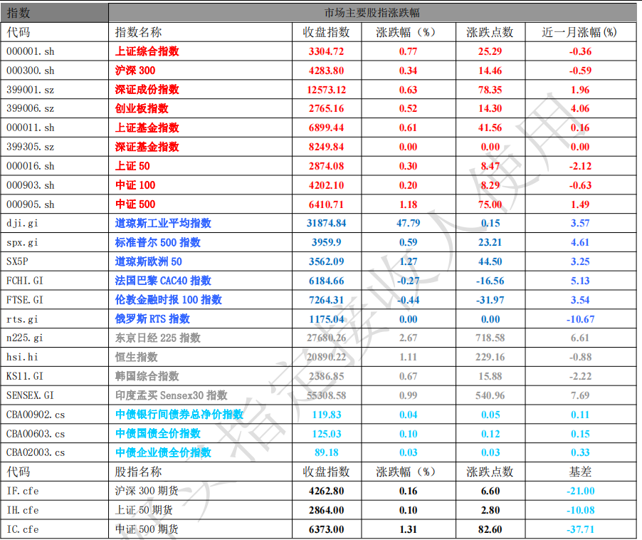 昨日,美国三大股指全线收涨,其中,道指涨 0.15%报 31874.84 点,标普 500 指数涨 0.59%报 3959.9点,纳指涨 1.58%报 11897.65 点。欧洲主要股指全线收跌,德国 DAX 指数跌 0.2%报 13281.98 点,法国 CAC40指数跌 0.27%报 6184.66 点,英国富时 100 指数跌 0.44%报 7264.31 点。亚太股市收盘全线走高,韩国综合指数涨 0.67%,报 2386.85 点;日经 225 指数涨 2.67%,创逾一个月高位至 27680.26 点,恒生指数上涨 1.11%。