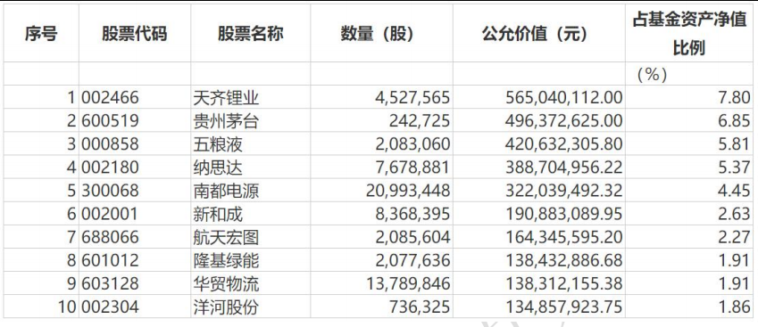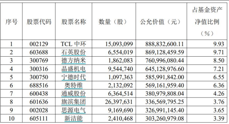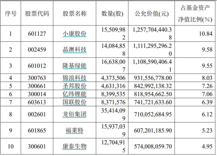 从广发小盘成长的前十大重仓股来看,主要重点布局了小康股份、晶澳科技、隆基绿能、圣邦股份、亿纬锂能等,持有比例均超过 7%。而相比一季度末,国联股份、福莱特新进前十大重仓股,而健帆生物、普利特退出前十大重仓股。