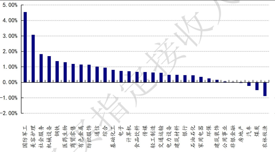 其中,国防军工、美容护理、社会服务居前,涨跌幅分别为 4.55%、3.07%、1.82%;汽车、煤炭、农林牧渔居后,涨跌幅分别为-0.23%、-0.50%、-0.89%。沪深两市有 3120 只个股上涨,占比 64.73%;1485 只个股下跌,占比 30.81%。105 只个股涨停,8 只个股跌停。北向资金全天净买入 36.78 亿元,其中沪股通净买入 19.33 亿元,深股通净买入 17.45 亿元。