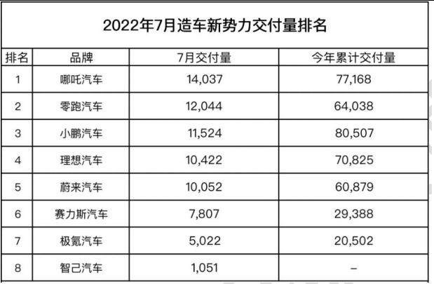 造车新势力相继公布 7 月交付量情况:哪吒汽车首夺新势力月销第一名,零跑汽车位列第二,小鹏汽车从冠军宝座上滑落至第三名。如果把广汽埃安(7 月销量 2.5 万辆)这家“传统新势力”也算上,那 7 月交付量榜单中,“蔚小理”则全部跌出了前三名。