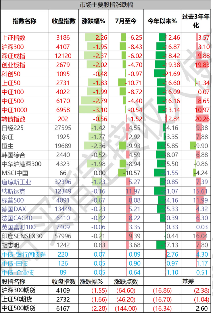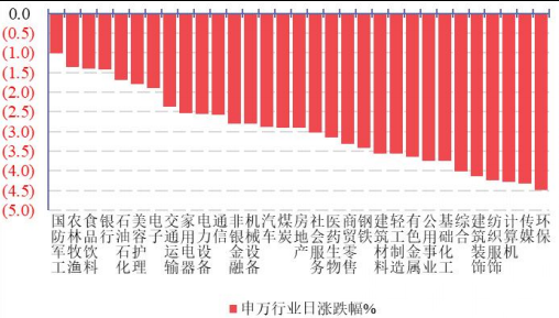 其中,国防军工、农林牧渔、食品饮料表现居前,涨跌幅分别为-1.02%、-1.36%、-1.41%,环保、传媒、计算机表现居后,涨跌幅分别为-4.49%、-4.33%、-4.27%。沪市有 145 只个数上涨,占比7.54%,深市有 47 只个数上涨,占比 9.40%。非 ST 个股中,52 只个股涨停,92 只个股跌停。股指期货主力合约3 个合约均下跌,其中,0 只期指好于现货指数。
