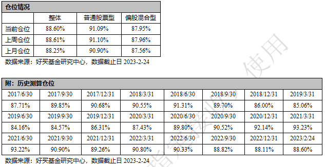 本周,公募高仓位股票基金整体小幅减仓0.01%,当前仓位88.60%。其中,普通股票型基金仓位下降0.01%,偏股混合型基金仓位下降0.01%,当前仓位分别为91.09%和87.95%。