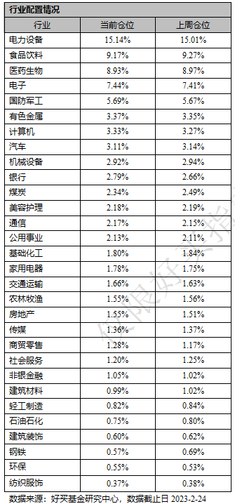 本周,公募高仓位股票基金配置比例位居前三的申万一级行业是电力设备、食品饮料和医药生物,配置仓位分别为15.14%、9.17%和8.93%;基金配置比例居后的三个行业是纺织服装、环保和钢铁,配置仓位分别为0.37%、0.55%和0.57%。