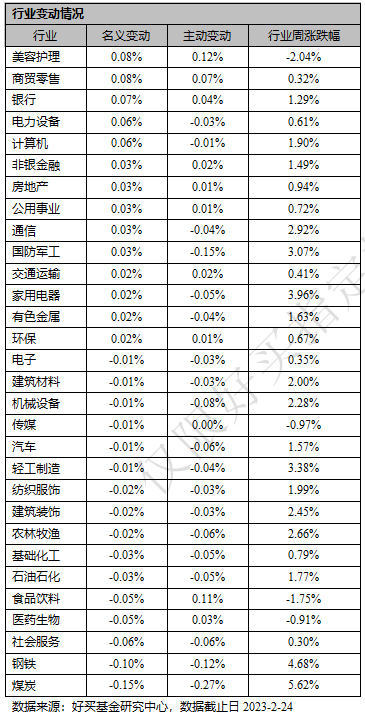 本周,行业权重变化方面主要增加的行业为美容护理、商贸零售和银行,增加幅度分别为0.08%、0.08%和0.07%;主要减少的行业为煤炭、钢铁和社会服务,减少幅度分别为0.15%、0.10%和0.06%。主动变化方面,主要加仓的行业为美容护理、食品饮料和商贸零售,主要减持的行业为煤炭、国防军工和钢铁。