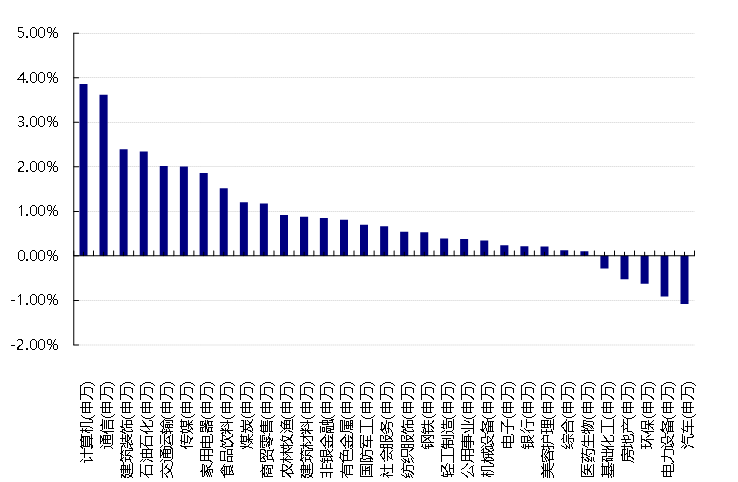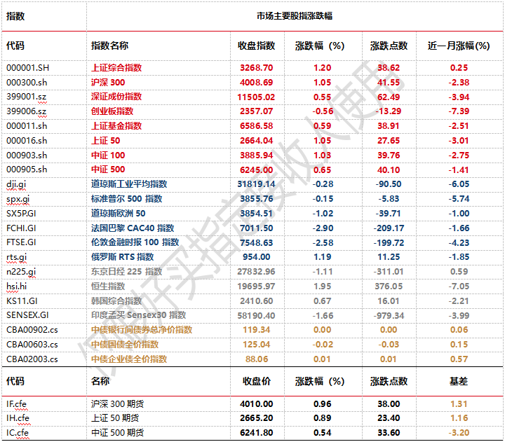 31个申万一级行业中有26个行业上涨。其中,计算机(申万)、通信(申万)、建筑装饰(申万)表现居前,涨跌幅分别为3.86%、3.62%、2.39%,环保(申万)、电力设备(申万)、汽车(申万)表现居后,涨跌幅分别为-0.62%、-0.91%、-1.08%。沪市有995只个数上涨,占比50.38%,深市有1241只个数上涨,占比45.11%。非ST个股中,10只个股涨停,0只个股跌停。股指期货主力合约3个合约均上涨,其中,0只期指好于现货指数。