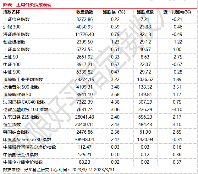 上周,沪深两市双双收涨。截止收盘,上证综指收于3272.86点,涨7.21点,涨幅为0.22%;深成指收于11726.40点,涨92.18点,涨幅为0.79%;沪深300收于4050.93点,涨23.88点,涨幅为0.59%;创业板收于2399.50点,涨29.12点,涨幅为1.23%。