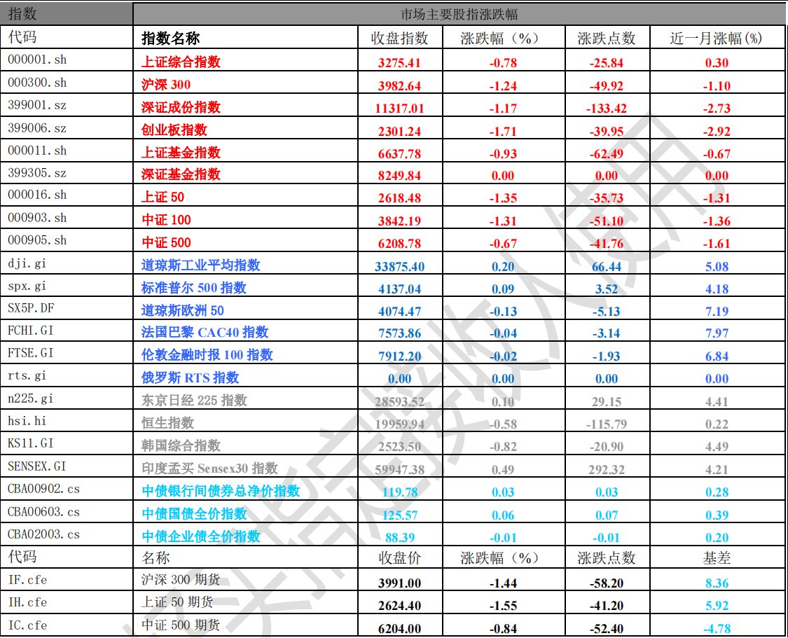 昨日,沪深两市双双收跌。截止收盘,上证综指收于 3275.41 点,跌 25.84 点,跌幅为 0.78%;深成指收于 11317.01 点,跌 133.42 点,跌幅为 1.17%;沪深 300 收于 3982.64 点,跌 49.92 点,跌幅为 1.24%;创业板收于 2301.24 点,跌 39.95 点,跌幅为 1.71%。两市成交 10833.28 亿元。小盘股强于大盘股。中证 100下跌 1.31%,中证 500 下跌 0.67%。