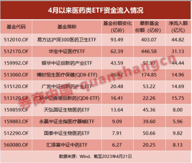 据 Wind 数据统计,4 月以来,易方达沪深 300 医药 ETF(交易型开放式指数基金)、华宝中证医疗 ETF、银华中证创新药产业 ETF、博时恒生医疗保健 ETF、广发中证创新药产业 ETF 等资金净流入明显,合计有超200亿资金涌入医药类 ETF。