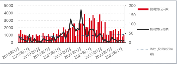 2023 年 3 月,股混基金发行共 96 只,份额 462 亿(其中普通股票型 40 只,份额 138 亿;偏股混合型基金发行 47 只,份额 270 亿),环比份额增长 60%,同比增长 11%。
