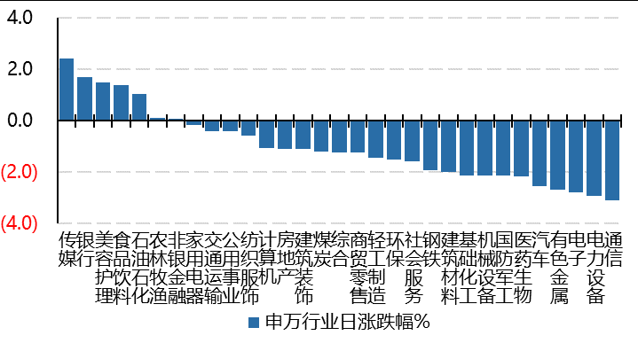 31 个申万一级行业中有 7 个行业上涨。其中,传媒、银行、美容护理表现居前,涨跌幅分别为 2.42%、1.69%、1.48%,通信、电力设备、电子表现居后,涨跌幅分别为-3.08%、-2.93%、-2.80%。沪市有 391 只个数上涨,占比 18.97%,深市有 116 只个数上涨,占比 23.20%。非 ST 个股中,35 只个股涨停,81 只个股跌停。股指期货主力合约 3 个合约均下跌,其中,1 只期指好于现货指数。