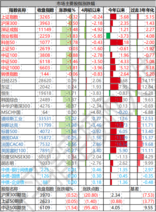 昨日,沪深两市双双收跌。截至收盘,上证指数收于 3264.87 点,跌幅为 0.32%;深成指收于 11149.01点,跌幅为 1.48%;沪深 300 收于 3962.67 点,跌幅为 0.50%;创业板收于 2259.19 点,跌幅为 1.83%。两市成交 11339 亿元,较前一日成交额增加 4.67%。大盘股强于小盘股。中证 100 下跌 0.88%,中证 1000 下跌1.81%。