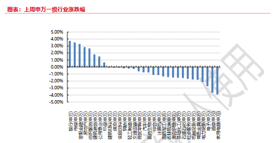 上周,沪深两市涨跌互现。截止收盘,上证综指收于 3334.50 点,涨 11.23 点,涨幅为 0.34%;深成指收于 11180.87 点,跌 157.79 点,跌幅为 1.39%;沪深 300 收于 4016.88 点,跌 12.21 点,跌幅为 0.30%;创业板收于 2267.63 点,跌 57.08 点,跌幅为 2.46%。两市成交 22428.33 亿元。总体而言,小盘股强于大盘股。中证 100 下跌 0.94%,中证 500 下跌 0.65%。31 个申万一级行业中有 8 个行业上涨。其中,银行(申万)、传媒(申万)、非银金融(申万)表现居前,涨跌幅分别为 3.75%、3.51%、3.29%,电子(申万)、通信(申万)、家用电器(申万)表现居后,涨跌幅分别为-2.74%、-3.65%、-3.91%。