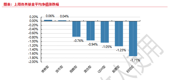 上周,国内基金涨跌不一,其中涨幅最大的是债券型,涨幅为 0.06%,跌幅最大的是封闭式基金,跌幅为-1.71%。