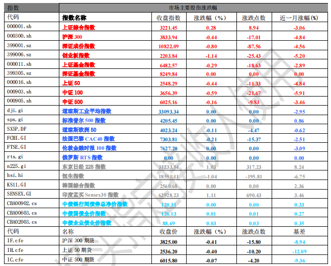 昨日,欧美主要市场普遍下跌,其中,道指下跌0.00%,标普500下跌0.00%;道琼斯欧洲50下跌0.11%。亚太主要市场涨跌不一,其中,恒生指数下跌 1.04%,日经 225 指数上涨 1.03%。