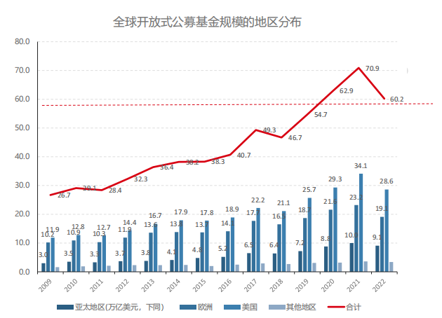 规模分布方面,到 2022 年年底,美国受监管开放式共同基金全球占比 48%,欧洲全球占比 32%,亚太地区全球占 15%。尽管亚太暂时不敌欧美,但是 ICI 认为,考虑到亚太庞大的人口规模、快速增长的经济发展和财富,以及政府推动个人账户储蓄和投资的努力,亚太地区非常值得关注。