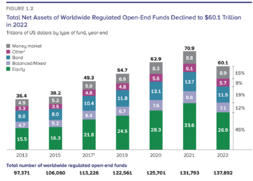 日前,美国投资公司协会(ICI)发布 2022 年度报告显示,截至 2022 年底,全球受监管的开放式共同基金(对应到我国开放式公募基金)规模从 2021 年底的 70.9 万亿美元降至 60.1 万亿美元,缩水 10.8 万亿美元(约折合 76.3 万亿元人民币)。ICI 在报告中指出,全球供应链问题、俄乌局势、全球范围通货膨胀加剧、各个央行收紧货币政策,利率上升等为背后原因。