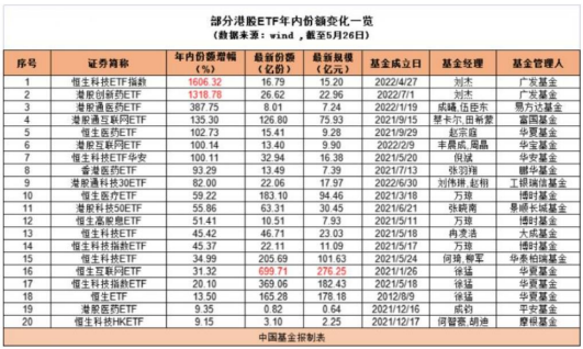今年以来港股市场持续震荡下跌,3 月下旬虽有小幅回调,但 4 月下旬之后又转跌,整体看,港股市场表现较为不理想,截止至 2023 年 5 月 29 日,根据 Wind 数据显示,恒生科技指数今年收益率约为-11.66%,恒生指数今年收益率约为-6.22%。不过资金越跌越买,多只港股 ETF 产品年内份额增幅明显。如广发基金两只港股 ETF 年内份额分别激增约 16 倍、约 13 倍,华夏恒生互联网 ETF 份额也持续增长,最新份额更是逼近 700 亿份。