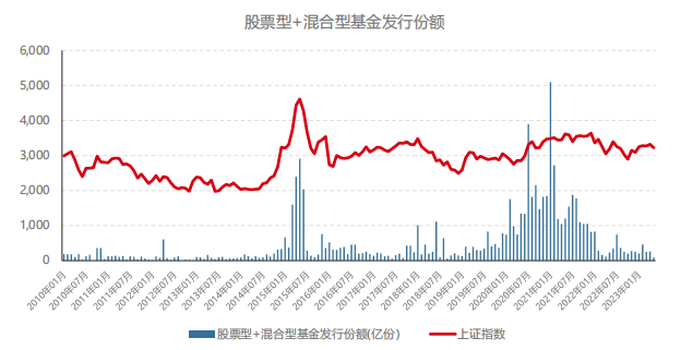 基金发行份额与市场表现相关,以股票+混合型基金发行份额为例,从 2010 年 1 月 31 日至 2023 年 5 月29 日数据来看,当市场表现较好时基金发行份额有较为明显的提升。