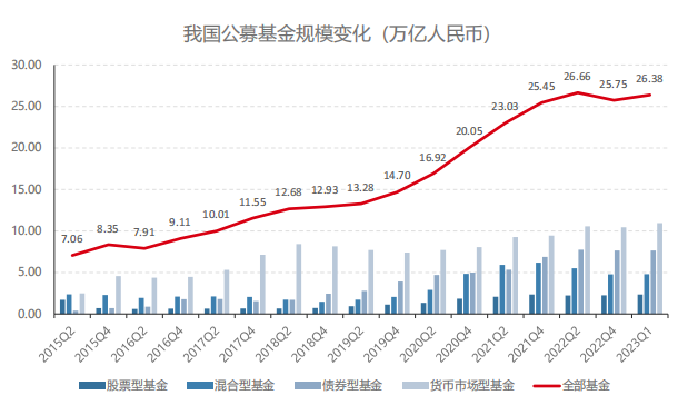 根据 Wind 数据显示,截止至 2023 年 3 月 31 日,我国公募基金规模达到约 26.38 万亿元人民币,其中股票型基金规模约 2.36 万亿元,混合型基金规模约 4.79 万亿元,债券型基金约 7.65 万亿元,货币型基金规模约10.95 万亿元。