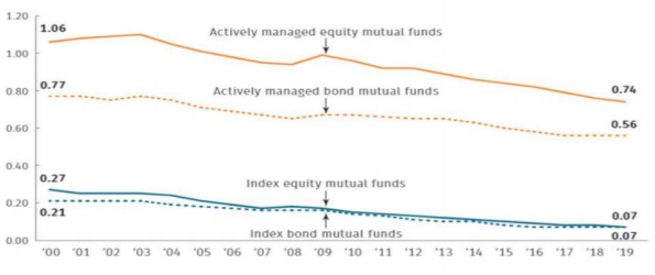 是否会求变?根据 ICI,美国共同基金费率近 20 年呈现下降趋势。