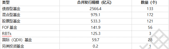 新发基金产品类型方面,债券型基金为发行主力,今年以来发行规模达2566.41亿元,发行规模占比超五成。QDII、另类投资产品发行规模相对较小,均不足百亿元。