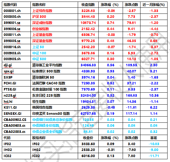 昨日,沪深两市涨跌互现。截止收盘,上证综指收于3228.83点,跌2.57点,跌幅为0.08%;深成指收于10873.74点,涨79.81点,涨幅为0.74%;沪深300收于3844.43点,涨7.73点,涨幅为0.20%;创业板收于2152.42点,涨9.41点,涨幅为0.44%。两市成交9654.06亿元,。小盘股强于大盘股。中证100上涨0.16%,中证500上涨0.30%。31个申万一级行业中有18个行业上涨。其中,汽车(申万)、家用电器(申万)、食品饮料(申万)表现居前,涨跌幅分别为3.04%、2.85%、2.49%,建筑装饰(申万)、银行(申万)、公用事业(申万)表现居后,涨跌幅分别为-1.03%、-1.22%、-1.57%。沪市有1109只个数上涨,占比56.15%,深市有1742只个数上涨,占比63.32%。非ST个股中,21只个股涨停,2只个股跌停。股指期货主力合约涨跌不一,其中,0只期指好于现货指数。