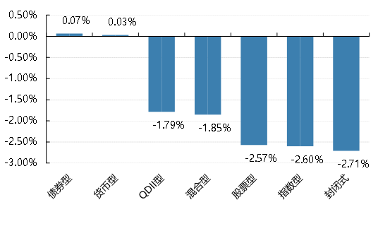 上周,国内基金涨跌不一,其中涨幅最大的是债券型,涨幅为0.07%,跌幅最大的是封闭型,跌幅为-2.71%。