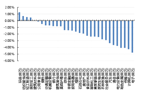31个申万一级行业中有5个行业上涨。其中,环保(申万)、纺织服饰(申万)、轻工制造(申万)表现居前,涨跌幅分别为1.27%、0.70%、0.54%,传媒(申万)、计算机(申万)、电子(申万)表现居后,涨跌幅分别为-4.06%、-4.26%、-4.77%。