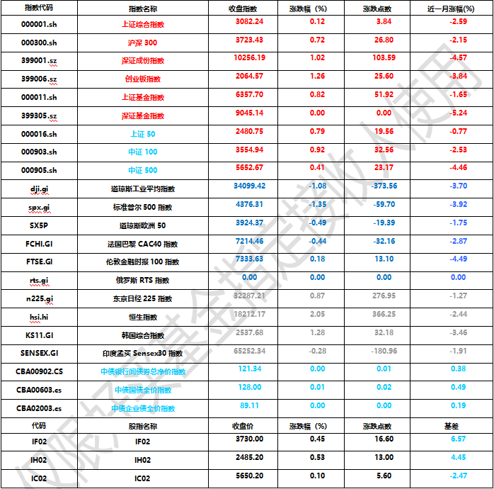31个申万一级行业中有无一个行业上涨。其中,食品饮料(申万)、传媒(申万)、美容护理(申万)表现居前,涨跌幅分别为2.21%、2.18%、2.03%,钢铁(申万)、公用事业(申万)、建筑装饰(申万)表现居后,涨跌幅分别为-1.05%、-1.05%、-4.15%。沪市有972只个数上涨,占比49.22%,深市有1192只个数上涨,占比43.33%。非ST个股中,12只个股涨停,3只个股跌停。股指期货主力合约3个合约均上涨,其中,0只期指好于现货指数。