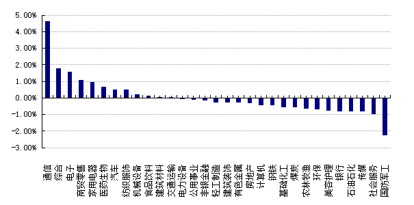 31个申万一级行业中有12个行业上涨。其中,通信、综合、电子表现居前,涨跌幅分别为4.64%、1.79%、1.58%,传媒、社会服务、国防军工表现居后,涨跌幅分别为-0.82%、-0.97%、-2.25%。沪市有732只个数上涨,占比31.36%,深市有929只个数上涨,占比31.88%。非ST个股中,76只个股涨停,8只个股跌停。股指期货主力合约涨跌不一,其中,1只期指好于现货指数。