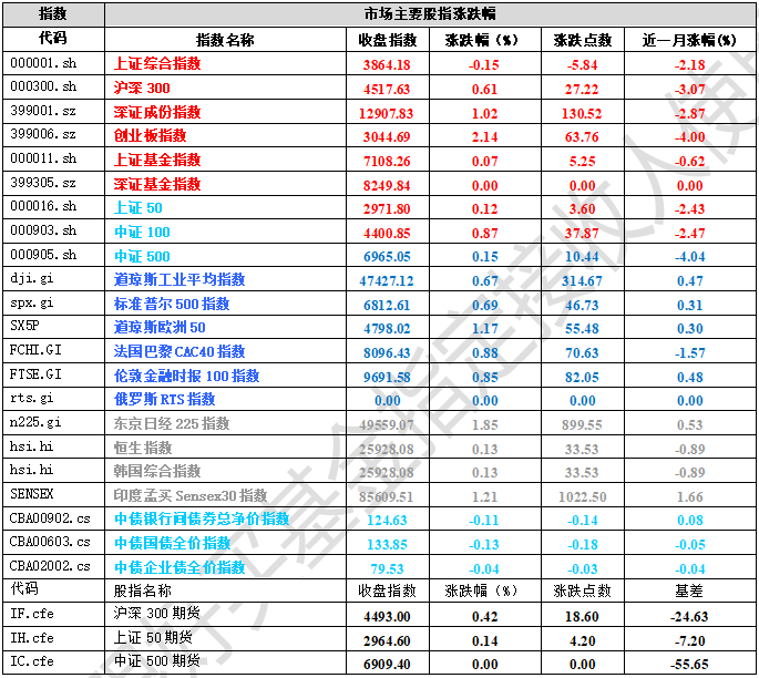 昨日,沪深两市涨跌互现。截至收盘,上证综指收于3864.18点,跌5.84点,跌幅为0.15%;深成指收于12907.83点,涨130.52点,涨幅为1.02%;沪深300收于4517.63点,涨27.22点,涨幅为0.61%;创业板收于3044.69点,涨63.76点,涨幅为2.14%。两市成交17833.46亿元,较前一日成交额减少1.59%。大盘股强于小盘股。中证100上涨0.87%,中证500上涨0.15%。