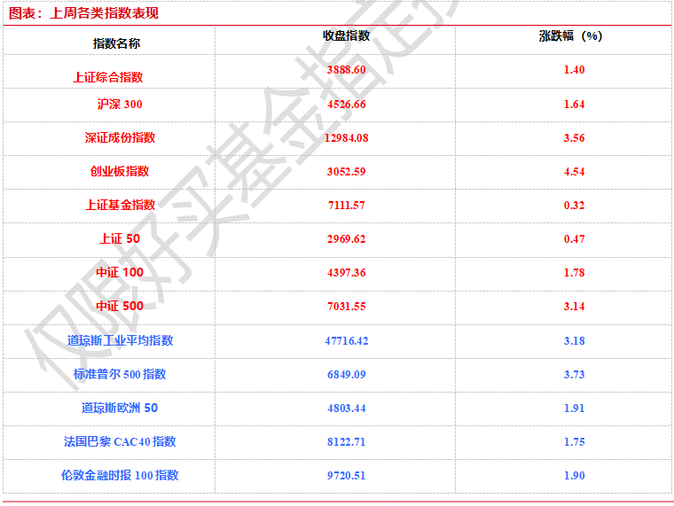 上周,欧美主要市场普遍上涨,其中,道指上涨3.18%,标普500上涨3.73%;道琼斯欧洲50 上涨1.91%。亚太主要市场普遍上涨,其中,恒生指数上涨2.53%,日经225指数上涨3.35%。