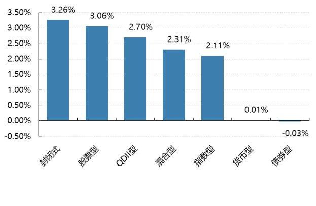 上周,国内基金涨跌不一,其中涨幅最大的是封闭式基金,涨幅为3.26%,涨幅最小的是债券型,涨幅为-0.03%。