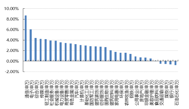 31个申万一级行业中有27个行业上涨。其中,通信(申万)、电子(申万)、综合(申万)表现居前,涨跌幅分别为8.70%、6.05%、4.43%,煤炭(申万)、银行(申万)、石油石化(申万)表现居后,涨跌幅分别为-0.51%、-0.59%、-0.73%。