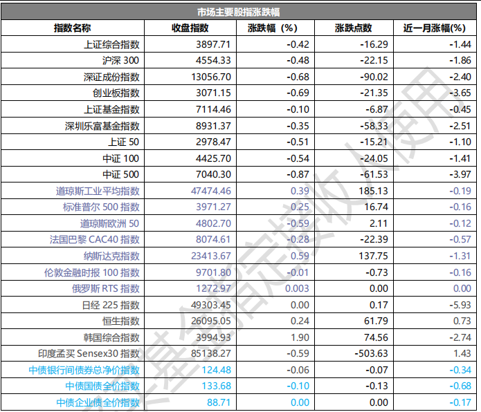 昨日,沪深两市双双收跌。截止收盘,上证综指收于 3897.71 点,跌 16.29 点,跌幅为 0.42%;深成指收于 13056.70 点,跌 90.02 点,跌幅为 0.68%;沪深 300 收于 4554.33 点,跌 22.15 点,跌幅为 0.48%;创业板收于 3071.15 点,跌 21.35 点,跌幅为 0.69%。两市成交 15934.30 亿元,较前一日交易量减少 14.97%。大盘股强于小盘股。中证 100 下跌 0.54%,中证 500 下跌 0.87%。